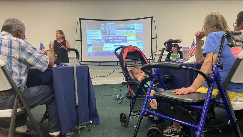 In an interview before the meeting, Hollis says, "It's obscene what the very wealthy people in this country get away with," and cites himself as a prime example. He made his fortune in stocks, and taxes on that income are far lower than they are for wages earned by actually working. Hollis thinks few people know about such loopholes, "and if they knew they would be outraged."…